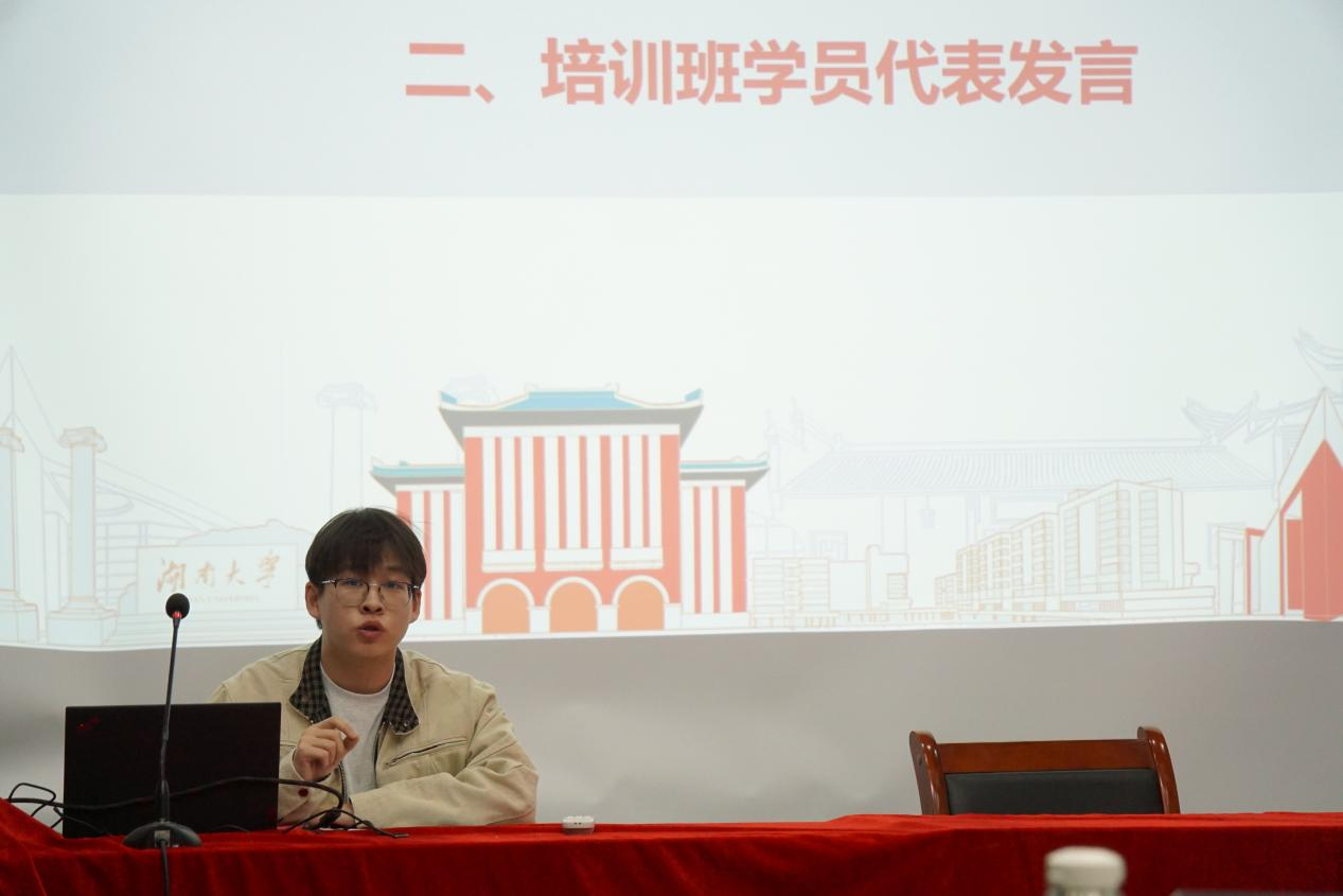 培训班学员代表孙博航发言,他表示,一方面要在学业上以身作则为同学们树立榜样,另一方面更要深刻理解党务工作的内涵与意义,将党的理论和精神融入实践中。并代表全体学生支委表态,一定会以饱满的热情、认真的态度,全身心投入培训中,严格遵守纪律,做到学有所思、学有所悟、学有所得。