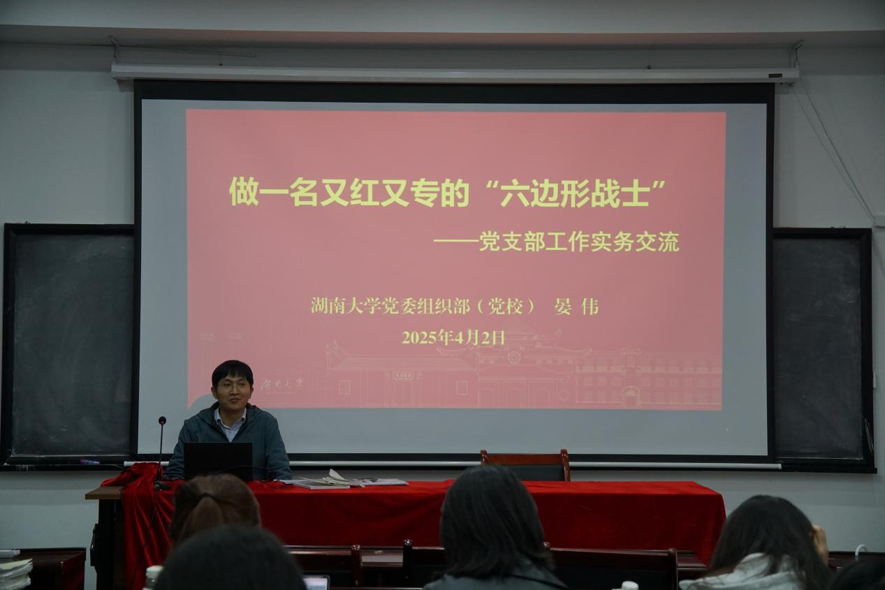 党委组织部(党校)干部晏伟为同学们授课,主要围绕“党建+业务能力提升”开展。课程以做一名又红又专的“六边形战士”——党支部工作实务交流为主题,从党支部建设与自身建设、党员发展与档案管理、组织关系转接与不合格党员处理三个方面出发,细致地讲解了学生党务工作的各个事项、提升技巧与管理规范。晏伟老师结合自身实际工作中遇到的典型问题,分享了处理复杂情况的经验,使同学们对这些专业性较强的工作有了更加清晰的认识。