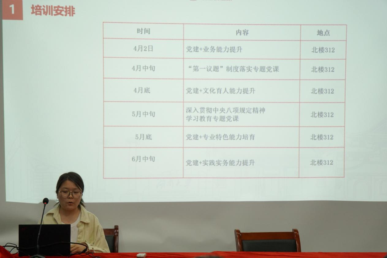 党委于北楼312开展“薪火相传守初心,新传赋能担使命”基层党务培训开班仪式暨第一次培训。院党委副书记李释然、组织干事戎丽娟出席开班仪式,本科生研究生党支部成员以及红心领航中心成员参加培训。