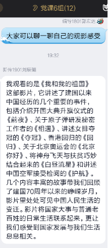新影院入党积极分子培训班第六小组于2019年12月18日晚19:00在线上展开了主题为“不忘跟党初心,牢记青春使命”的研讨活动。本次研讨活动,第六小组全员到齐,在线上就红色革命电影和中国改革开放主题电影展开了热烈的讨论与交流。