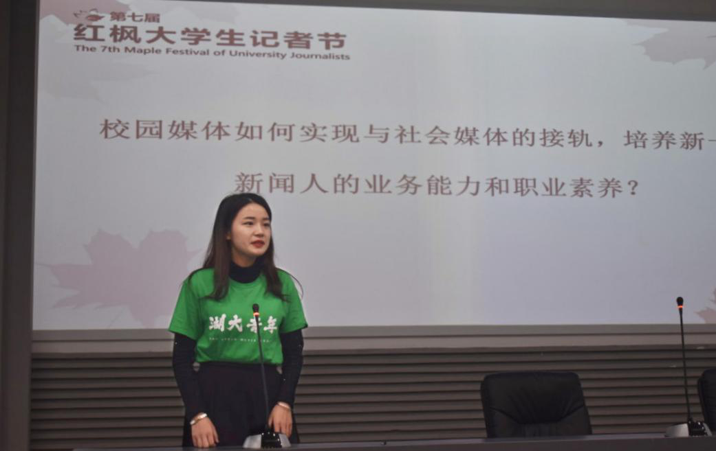分会场讨论结束后,全体与会嘉宾人员来到主会场,对各论坛的发言观点进行了总结交流。此外,获得“第六届红枫大学生记者节扶持计划”立项的“岳麓学子论坛”、“湖大艺术有个圈”、“湖大青年传媒”负责人熊玲珑、宋爽、李子怡,还上台与大家分享了所在校媒的内容生产和管理经验总结,并提出“向更符合青年面貌,更关注社会现象,更具代表性和影响力的校园媒体发展”的未来发展目标。现场气氛热烈,掌声雷动。
