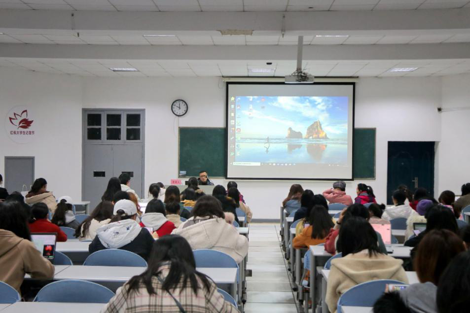 新传院党委副书记、纪委书记李洪玉,院学工办、实践教学部、新闻系、新媒体系的教师代表,以及各年级学生代表聆听了本次讲座。