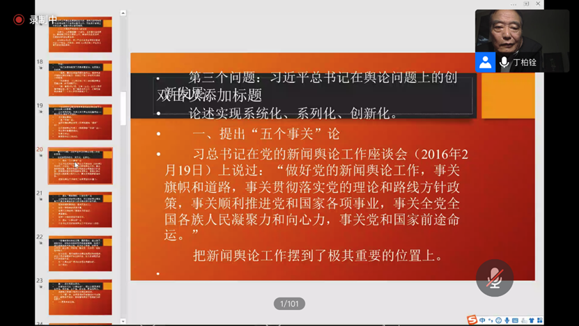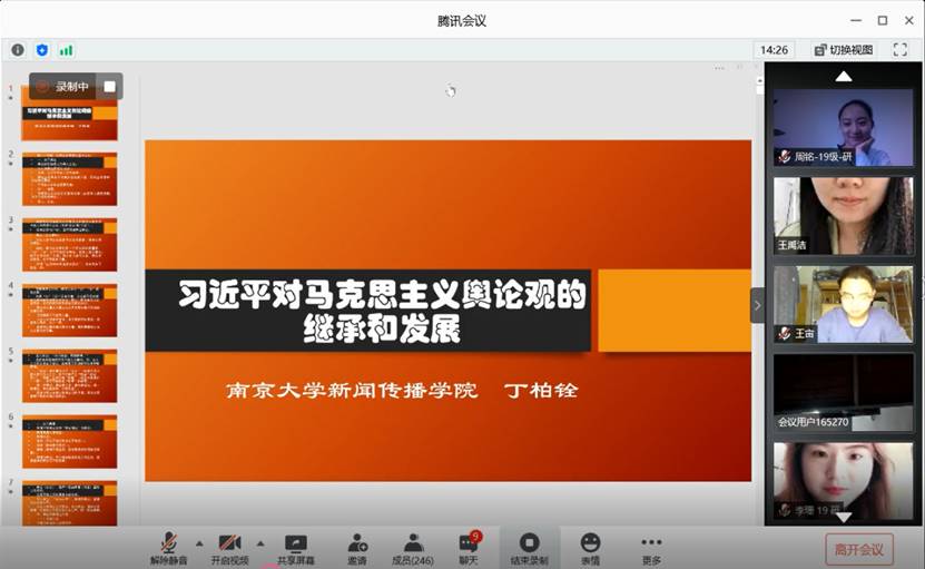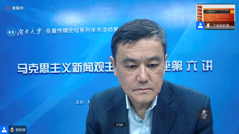 马克思主义新闻观研究中心于“云端”腾讯会议室举办了新学期的第一场岳麓传媒论坛马克思主义新闻观主题系列讲座。此次学术讲座以“习近平总书记对中国共产党舆论观的继承和发展”为主题,由南京大学新闻传播学院教授、博士生导师丁柏铨担任主讲嘉宾,新传院特聘教授、岳麓学者雷跃捷担任主持人,校内外师生200余人参与。