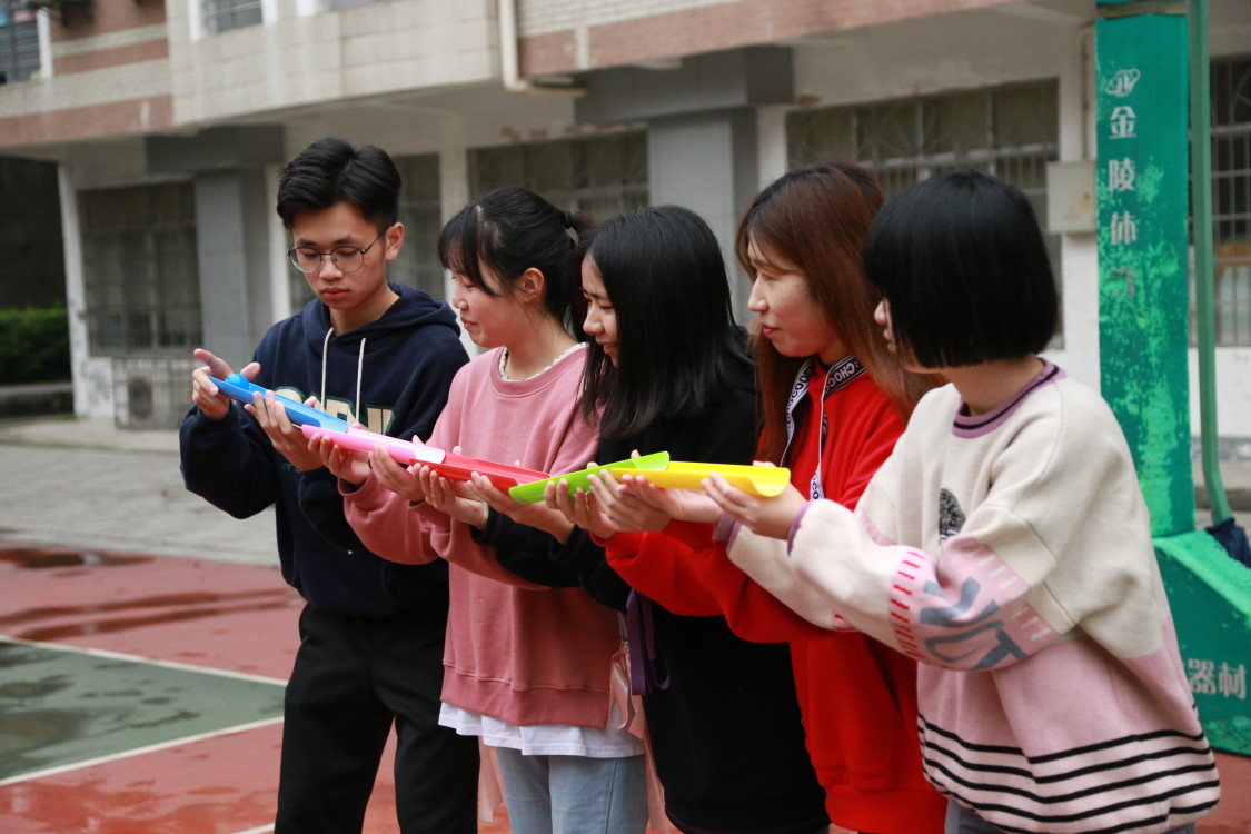 拔河比赛结束后,紧接着的是“珠行万里”,这个项目需要五个同学手拿U型管循环接力传递小球,导进杯子中。这个项目要求良好的平衡力、协调力和默契度。在比赛前,各班同学各显神通,探索不同的传递技巧,稳中求快。经过沟通和练习,他们的接力和传递配合得流畅默契,比赛的同时也让观看的同学体验到视觉的享受。