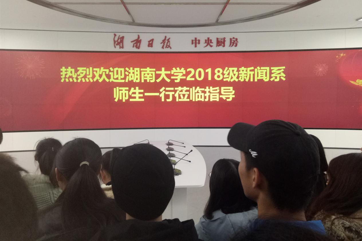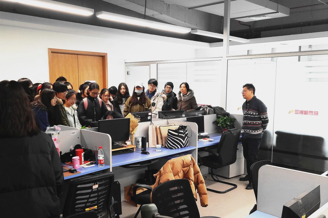 在本次见习中,全体师生首先参观了湖南日报集团的多个职能部门,包括三湘都市报工新媒体中心、大报编辑部以及“中央厨房”工作间。在《三湘都市报》的工作室内,负责人向同学们介绍了《三湘都市报》的转型举措,展示了新闻采写工作小组的职能分工并告诉大家:新媒体从业者应具备怎样的素养及哪些专业技能。