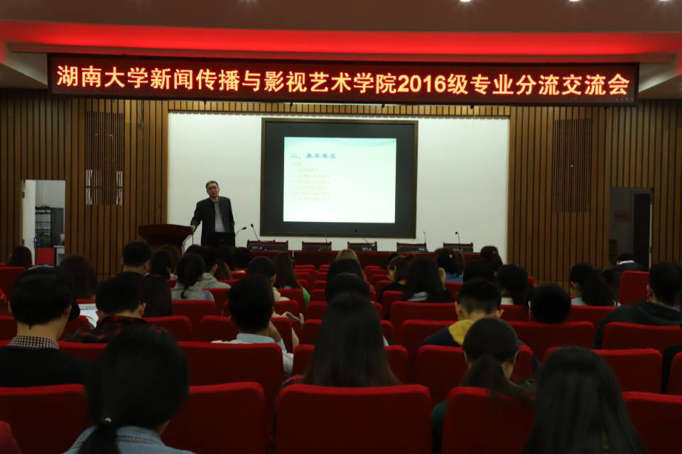 新闻传播与影视艺术学院在教学北楼217学术报告厅召开新闻传播学16级专业分流交流会,邀请了新影院新闻系主任徐琼、广告系主任莫梅锋、媒介经营管理系主任刘社瑞、网络与新媒体系老师戴松为即将选择分流专业的同学们进行专业介绍并提供指导。