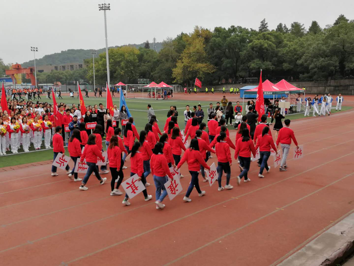 运动会开幕正值天气降温,但运动员的热情却温暖了这份寒冷。起跑的枪声、主席台的音乐声、人群中的加油助威声和欢呼呐喊声交织在一起,谱写成一篇拼搏激昂的乐章。