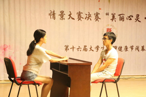 本届大学生心理健康节从5月开始,历时一个月,全校同学都积极参与其中。闭幕式以新影院同学精彩的舞蹈开场,带动了现场气氛。在党委学生工作部张浩副部长致欢迎辞后,同学们自编自导自演的心理情景剧正式上演。