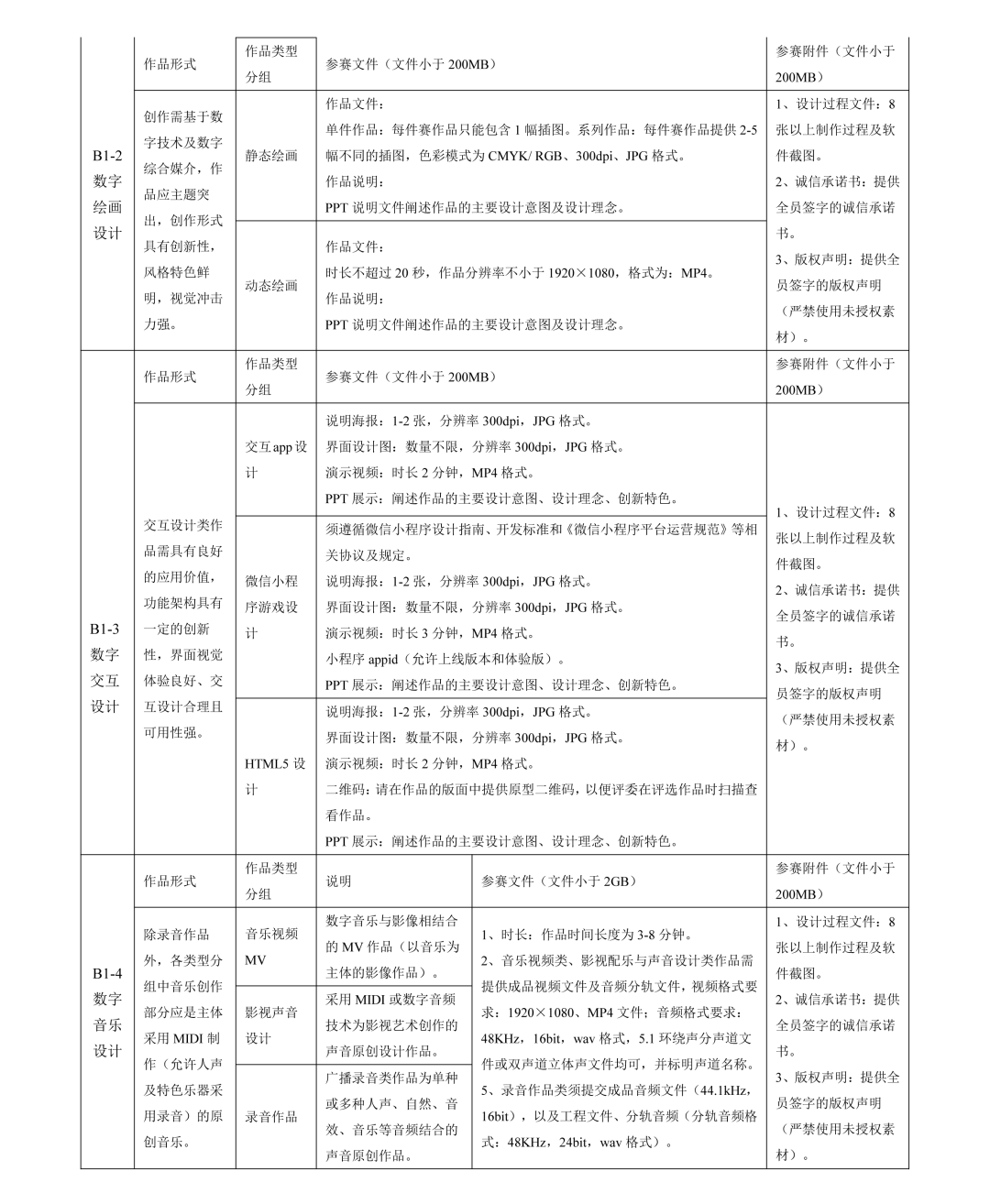 B 类为主题创作赛。B 类包括:B1 全媒体设计;B2 数字智能产品设计。B1 全媒体设计,细分以下类别单独评审:B1-1 数字影像动画设计(影视、动画、微电影)、B1-2 数字绘画设计、B1-3 数字交互设计、B1-4 数字音乐设计。B1-1 数字影像动画设计分为两个竞赛单元:数字影视组;数字动画组。借助数字化设备、采用影视拍摄或动画制作技术进行创作,反映一定故事情节或体现人文、历史、景观、文化特征的作品,形式包括但不仅限于影视短片、微电影、数字短片、纪录片、二维或三维动画等。B1-2 数字绘画设计分为两个竞赛单元:静态绘画组及动态绘画组。创作需基于数字技术及数字综合媒介,作品应主题突出,创作形式具有创新性,风格特色鲜明,视觉冲击力强。B1-3 数字交互设计分为三个竞赛单元:交互 App 设计;微信小程序游戏设计;HTML5 设计。交互设计类作品需具有良好的应用价值,功能架构具有一定的创新性,界面视觉体验良好、交互设计合理且可用性强。B1-4 数字音乐设计分为三个竞赛单元:音乐视频 MV、影视声音设计、录音作品。采用 MIDI 或数字音频技术录制的原创音乐作品,内容健康、积极向上。B2 数字智能产品设计,细分以下类别单独评审:B2-1 数字智能交通与工程(各类型智能交通工具、工程器材、工业设备等);B2-2 数字智能公共与家居(各类型用于公共环境或家居环境的智能产品);B2-3 数字智能电子与文创(各类型智能电子产品或文化创意产品)。突出数字创意设计的大赛主题,体现智能化生活。借助数字化设备,采用三维建模及动画制作技术进行相应创作。参赛内容具体要求详见附件一。