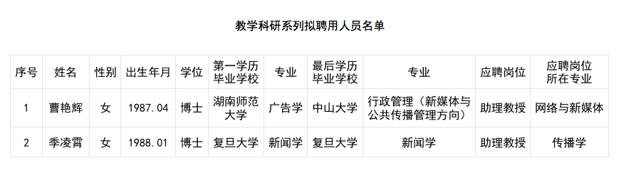 为做好人才引进工作,学院根据《成人av 教师招聘管理暂行办法》(湖大人字〔2016〕24号)、《新闻传播与影视艺术学院教师招聘工作流程》(2018年1月15日院党政联席会议修订)的相关规定,经教学委员会组织教学试讲、学院组织师德师风谈话,提请党政联席会决议,拟聘曹艳辉、季凌霄为助理教授。