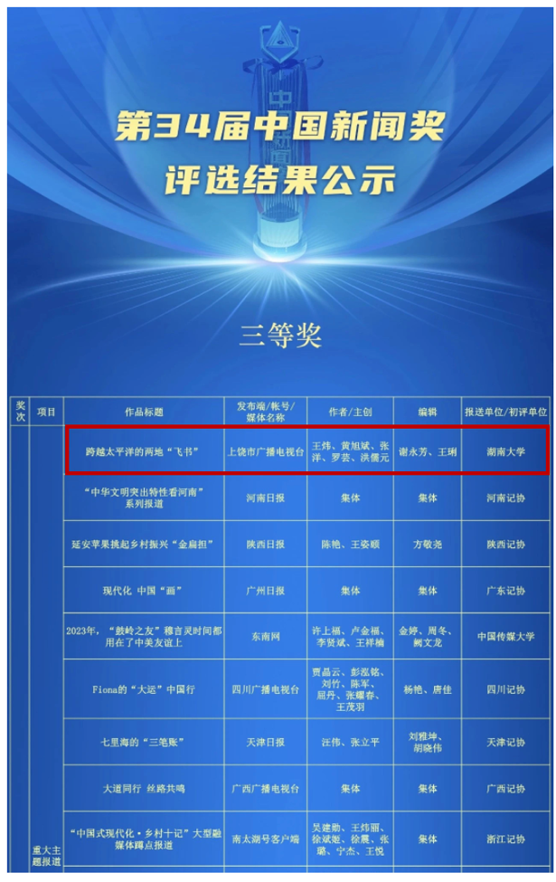 2024年10 月 29 日,中国记协对第 34 届中国新闻奖评选结果进行公示,来自全国各级各类媒体的 378 件作品入选拟获奖名单。其中,上饶市广播电视台的新闻专题片《跨越太平洋的两地 “飞书”》荣获第 34 届中国新闻奖重大主题报道三等奖。这是自2016年担任试点报送单位以来,成人av